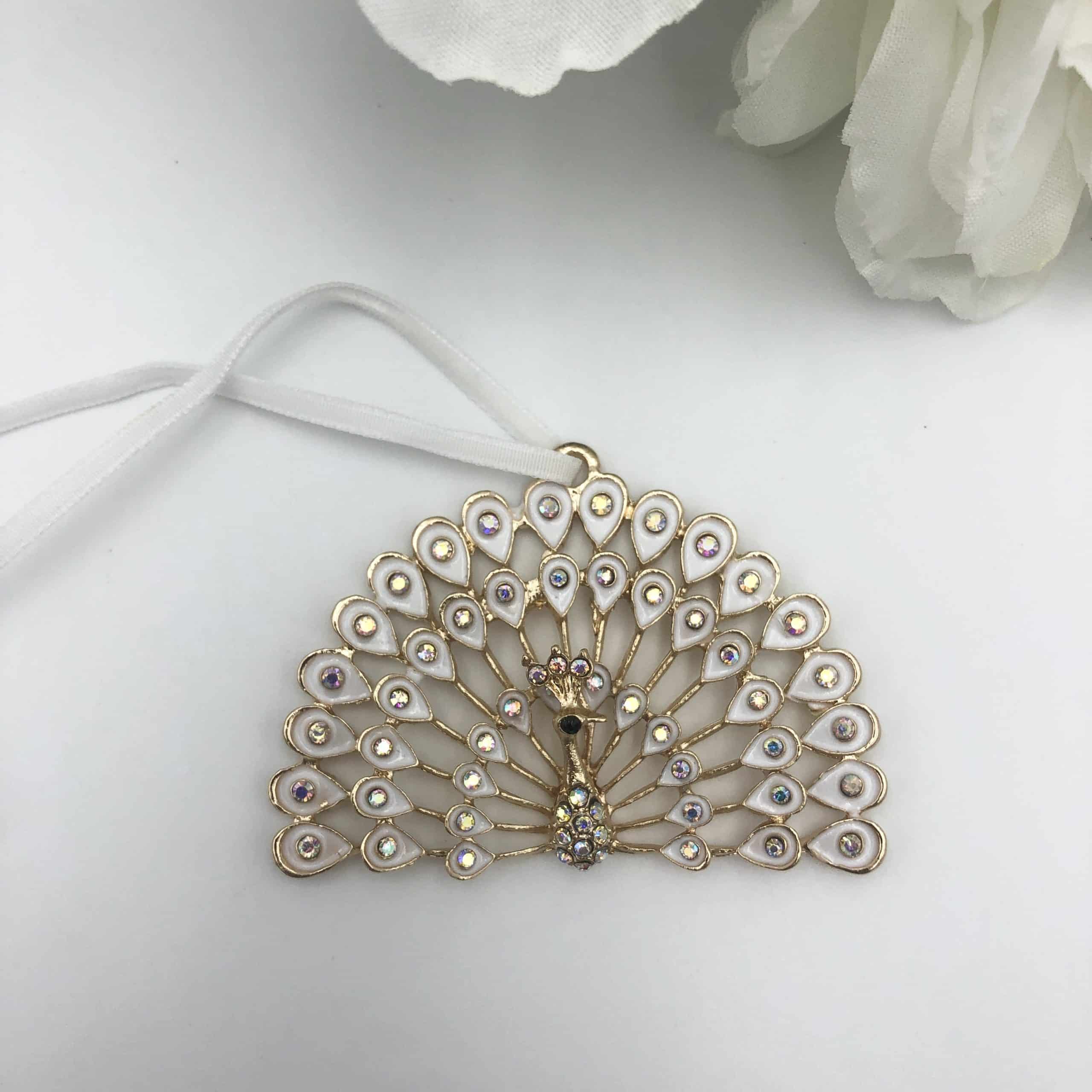 Elevate your decor with this exquisite White Peacock Ornament. Meticulously crafted from metal and measuring 6.5cmX5cm, its dazzling design features a fan of iridescent jewels, adding a touch of elegance to any setting. Captivating and charming, this lovely ornament will bring a smile to your heart.